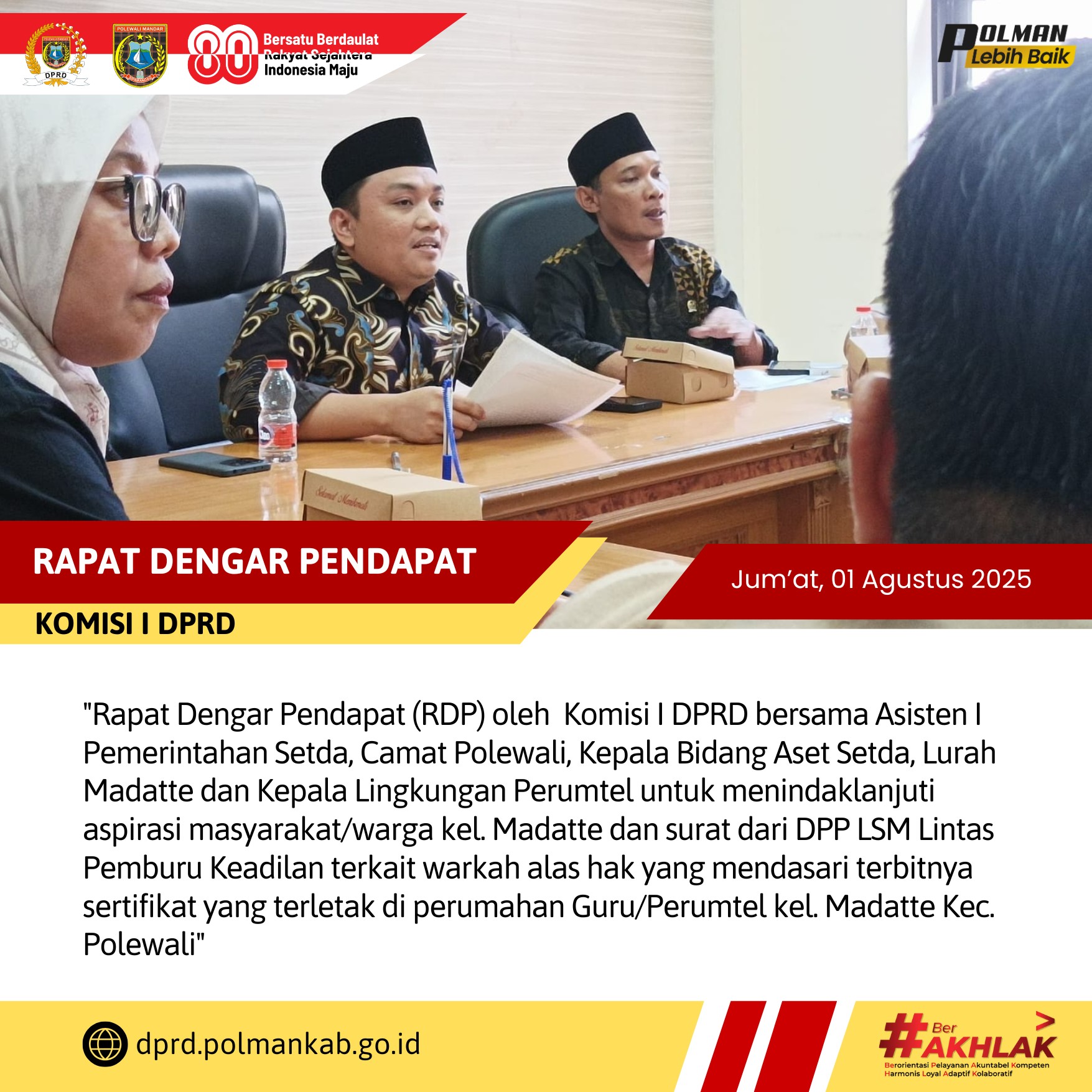 Komisi I DPRD Kabupaten Polewali Mandar menggelar Rapat Dengar Pendapat (RDP) bersama Ketua DPRD dan sejumlah pihak terkait untuk menindaklanjuti aspirasi masyarakat/warga Kel. Madatte Kec. Polewali...