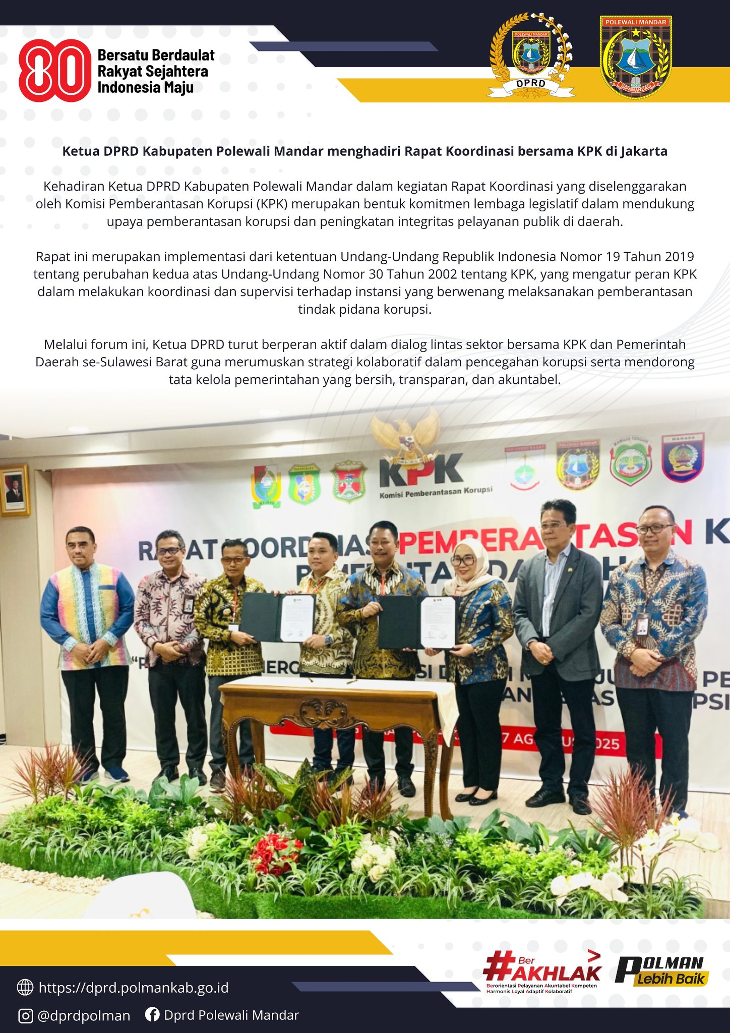 Ketua DPRD Kabupaten Polewali Mandar menghadiri Rapat Koordinasi bersama KPK sebagai bagian dari komitmen mendukung upaya pencegahan korupsi dan peningkatan integritas pelayanan publik di daerah.Kegiatan ini menjadi ruang dialog strategis antara KPK dan pemerintah daerah se-Sulawesi Barat dalam memperkuat koordinasi serta merumuskan langkah bersama mewujudkan tata kelola pemerintahan yang bersih dan akuntabel. (Kamis, 07 Agustus 2025)...