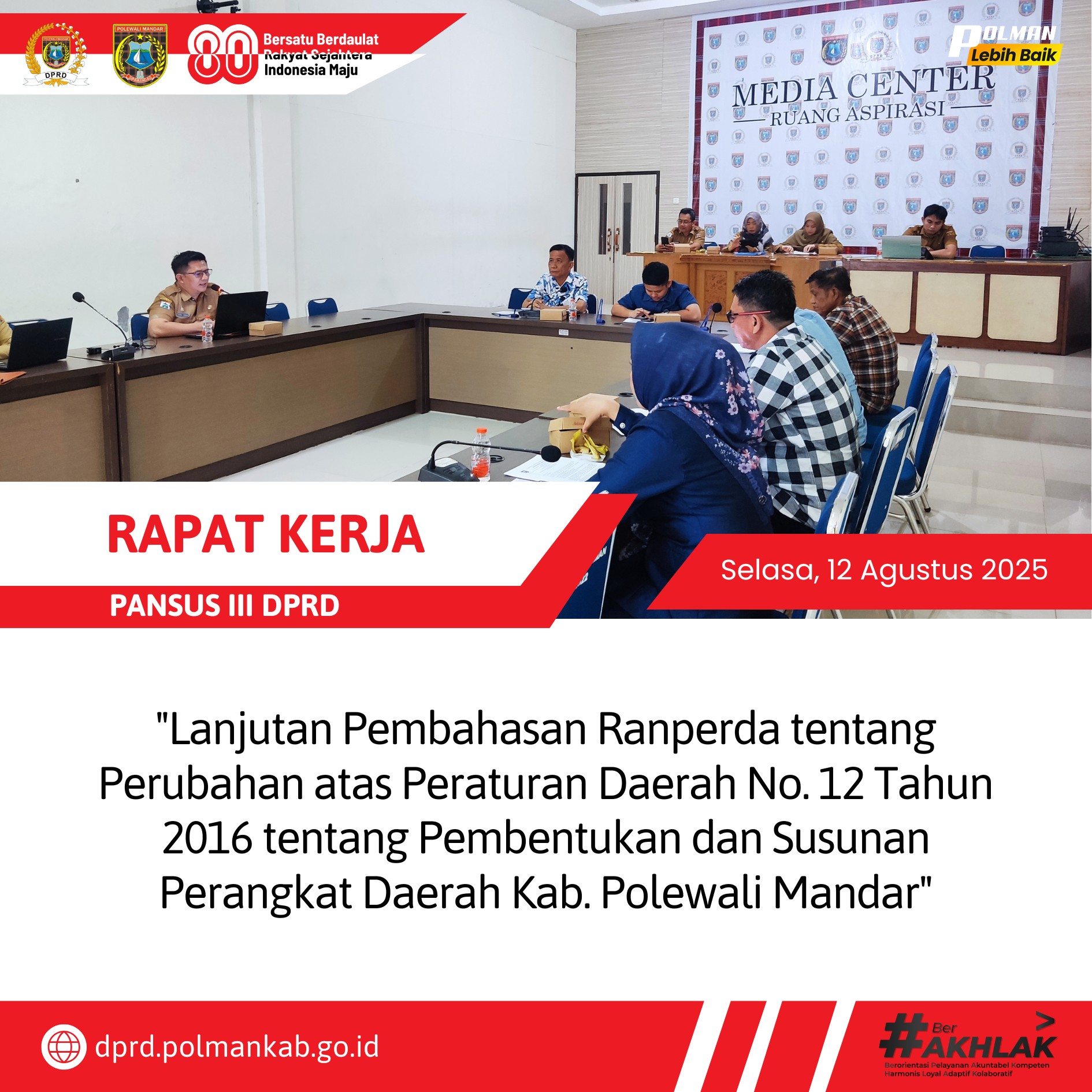 Pansus III DPRD menggelar rapat kerja membahas lanjutan Rancangan Peraturan Daerah (Ranperda) tentang Perubahan atas Peraturan Daerah Nomor 12 Tahun 2016 mengenai Pembentukan dan Susunan Perangkat Daerah Kabupaten Polewali Mandar.Pembahasan ini menjadi bagian dari komitmen DPRD untuk memastikan struktur perangkat daerah yang efektif, efisien, dan sesuai dengan kebutuhan pembangunan daerah. (Selasa, 12 Agustus 2025)...