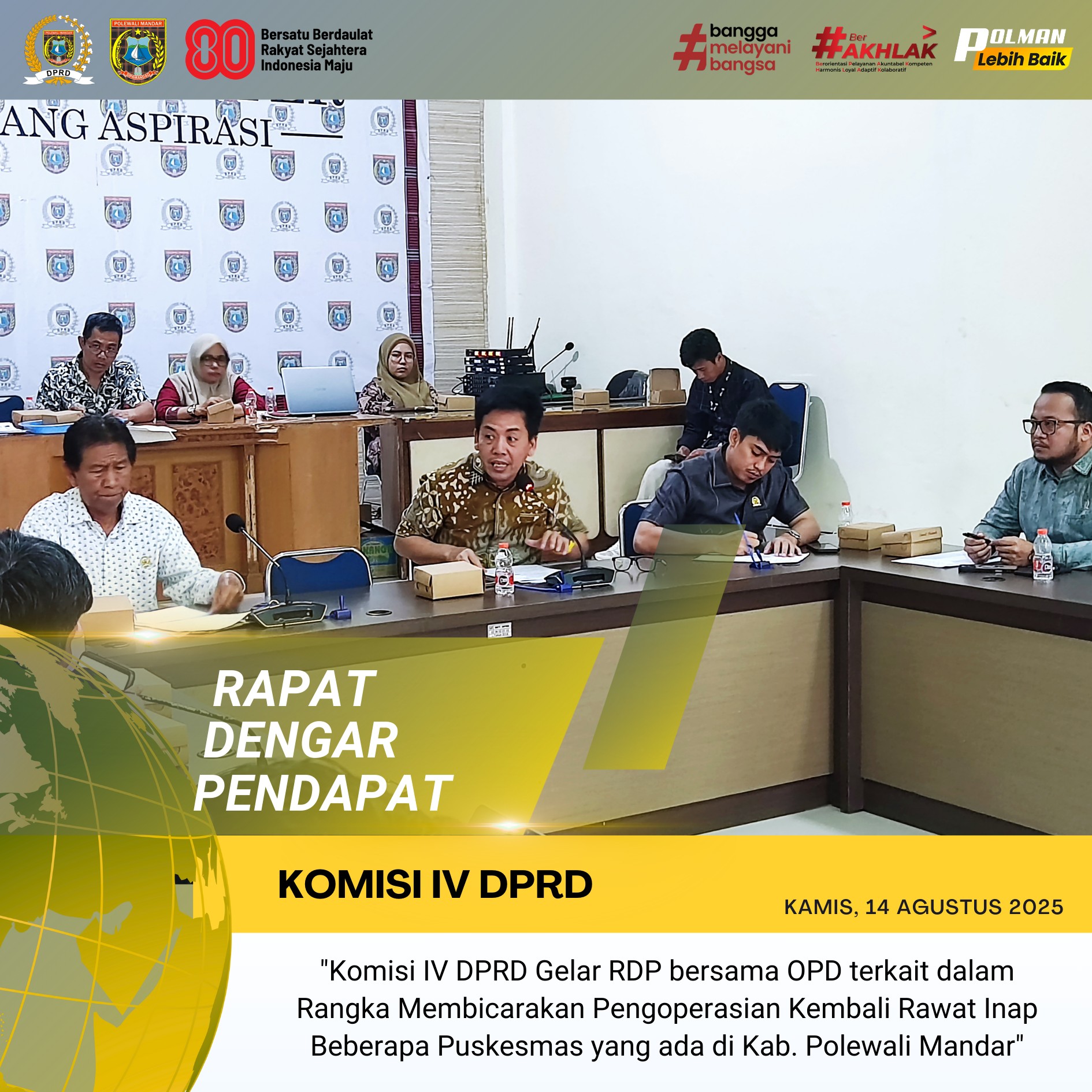 Komisi IV DPRD Kabupaten Polewali Mandar menggelar Rapat Dengar Pendapat (RDP) bersama OPD terkait.Pembahasan difokuskan pada rencana pengoperasian kembali layanan rawat inap di beberapa Puskesmas yang ada di Kabupaten Polewali Mandar.Langkah ini diharapkan dapat meningkatkan akses dan kualitas pelayanan kesehatan bagi masyarakat. (Kamis, 14 Agustus 2025)...