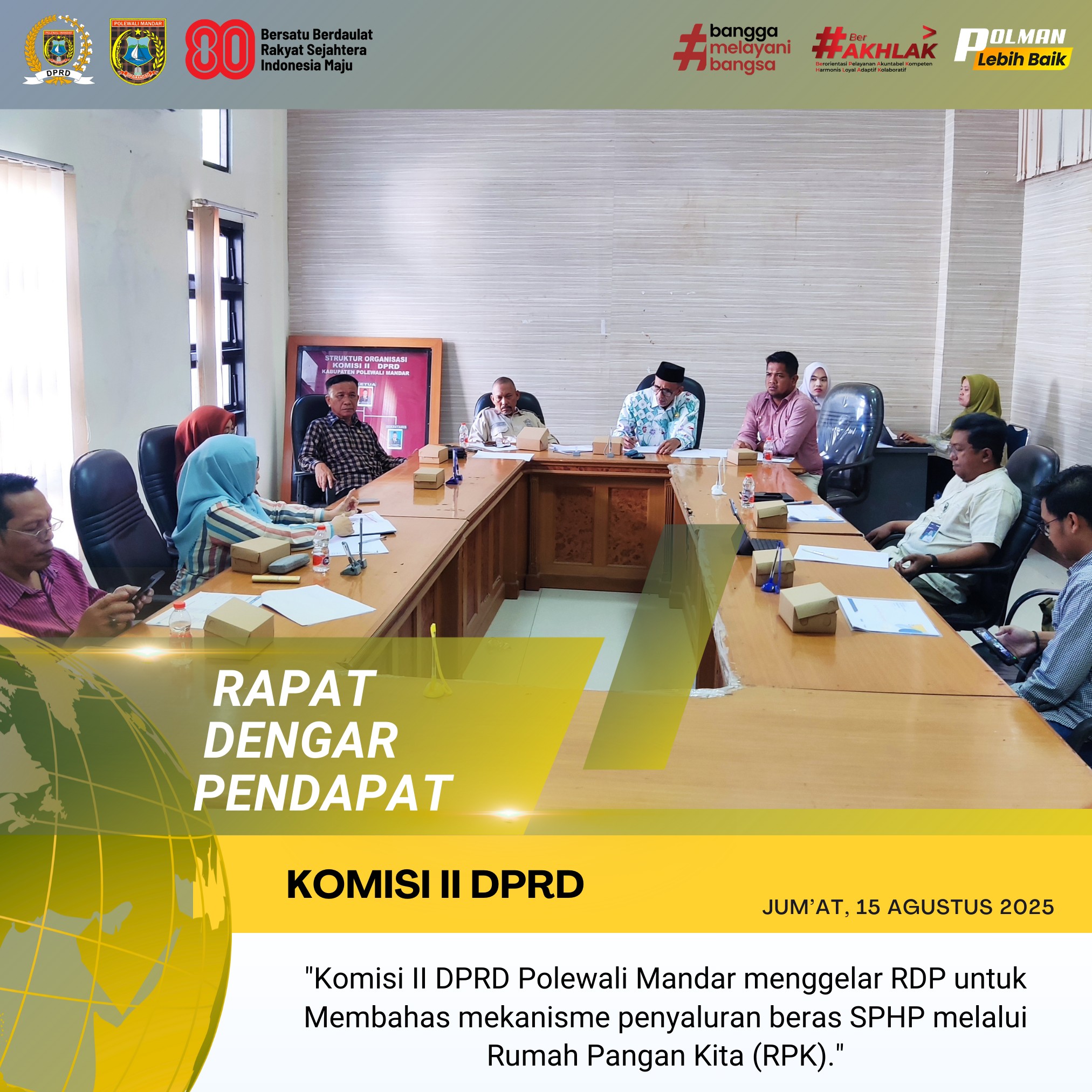 Komisi II DPRD Polewali Mandar menggelar Rapat Dengar Pendapat (RDP) bersama pihak terkait, membahas mekanisme penyaluran beras SPHP melalui Rumah Pangan Kita (RPK). Forum ini diharapkan dapat memperkuat pengawasan, memastikan distribusi tepat sasaran, serta menjaga stabilitas harga beras di masyarakat. (Jumat, 15 Agustus 2025)...