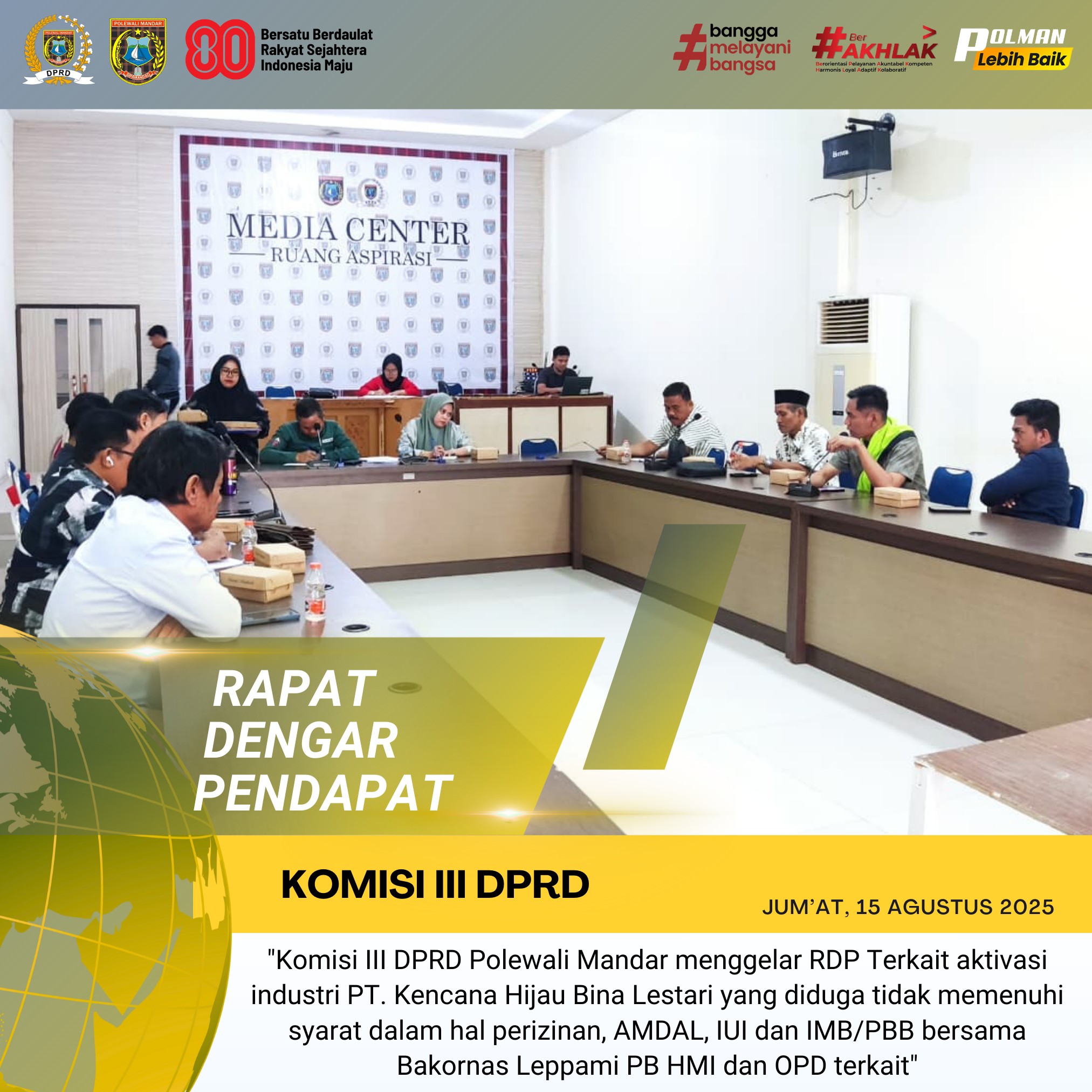 Komisi III DPRD Polewali Mandar menggelar Rapat Dengar Pendapat (RDP) bersama Badan Koordinasi Nasional Lembaga Pariwisata & Pecinta Alam Mahasiswa Islam (Bakornas Leppami PB HMI) serta OPD terkait. RDP ini membahas aktivasi industri PT. Kencana Hijau Bina Lestari yang diduga belum memenuhi syarat dalam hal perizinan, AMDAL, IUI, serta IMB/PBB. (Jumat, 15 Agustus 2025)...